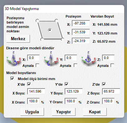 MODEL ÖLÇÜ BİRİMİ BÖLÜMÜNDE BULUNAN TİK İŞARETLERİNİ KALDIRDIĞINIZDA SADECE O SEÇENEĞİ DİĞER SEÇENEKLERDEN BAĞIMSIZ BOYUTLANDIRA BİLİRSİNİZ MERKEZLE SEÇENEĞİ MODELİ AÇILAN SAYFAYA SIĞDIRIR VE YAPIŞTIR SEÇENEĞİ MODELİN ARTCAM 2008 E AYARLANDIĞI ŞEKİLDE AKTARIR ARTIK TAKIM YOLU ATAMAYA HAZIRDIR MODEL
